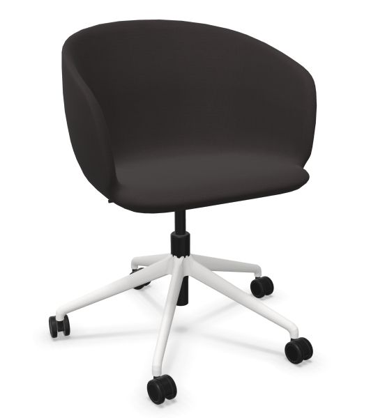 De zitting is uitgevoerd in Dark Graphite (G-60084) voor een stijlvol, tijdloos karakter, terwijl het wit semi-mat frame (RAL 9010) een fris en licht contrast toevoegt. Voor optimale mobiliteit is de stoel uitgerust met harde wielen die geschikt zijn voor zachte vloeren, waardoor deze soepel en geruisloos verplaatst kan worden.