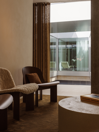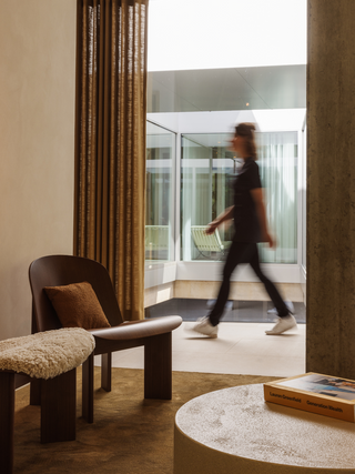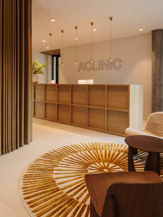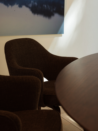 De wachtruimte aan de balie werd gezellig gemaakt met Chisel Lounge Chairs van HAY in op waterbasis gelakt notenhout. Deze eigentijdse stoelen werden ontworpen door de Noorse designer Andreas Bergsaker. Eén stoel werd bekleed met schapenvacht, de andere bleef onbekleed. De naam, afgeleid van het traditionele timmerwerktuig de beitel, weerspiegelt het idee om een massief houten stoel te creëren met een onderscheidend tijdloos silhouet. De zachte, organisch gevormde zitting en rugleuning zijn met zorg ontworpen, met optimaal vakmanschap en ergonomie als uitgangspunten. De unieke schuine poten met afgeschuinde randen weerspiegelen subtiel de verwijzing naar de beitel. De Ethnicraft Geometric bijzettafel in teak van Alain Van Havre past hier wonderwel bij. Geometrische vormen kruisen elkaar en creëren interactie. Deze bijzettafel ziet er vanuit iedere invalshoek helemaal anders uit.