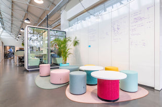 Een lege verdieping werd omgetoverd tot een grote nieuwe kantoorruimte. Naast de vergaderruimte werd een speelse ‘brainstorm area’ ingericht. De mobiele en lichtgewicht Narbutas Giro poefs in vrolijke kleurtjes geel, roze en mint en verschillende vormen, combineren vlot met de leuke gekleurde Parthos koffietafeltjes van hetzelfde merk. De tafeltjes bestaan uit een gekleurde cilindrische kolom en een wit rond tafelblad. Ze geven flair aan deze brainstormplek en kunnen moeiteloos verplaatst worden indien nodig. De leuke tapijten in keivorm en in verschillende kleuren werken deze brainstorm plek af tot een warm en gezellig geheel.