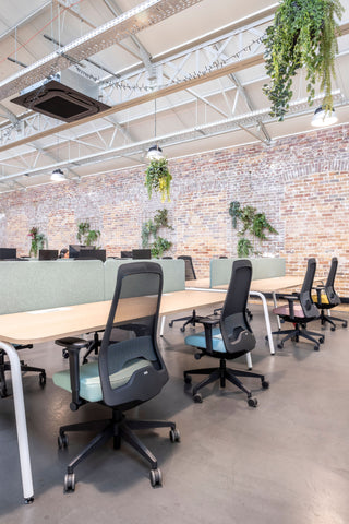 Ook de gekozen ‘werkbenchen’ zijn van Narbutas. Ze hebben een prachtige hedendaagse look. In alle eenvoud zijn ze ideaal voor een open-space kantoor. De serie heet ‘Round’, de werktafels met organisch ronde vormen hebben immers een tafelblad in melamine witte eik met subtiel afgeronde hoeken. De fijne poten zijn wit en ook de zachte tussenschermen in kleur ‘light mint’ zijn afgerond. Ze zijn duurzaam en zorgen voor akoestisch comfort en privacy. Verder plaatsten we ook een aantal Zit-sta werkbanken van Narbutas met opnieuw dezelfde kleuren.