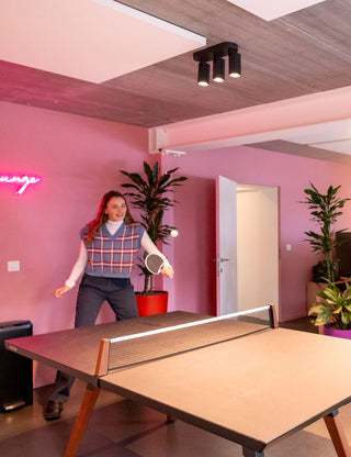 Een oude keuken werd omgetoverd tot nieuwe superleuke en hippe lounge en gameroom met PlayStationhoek en pingpongtafel van het Franse merk Cornilleau. De PlayStation rust op een handige ladenkast van Narbutas. Een prachtige olijfkleurige treinbank, die ook handig dient als room devider, zorgt voor comfortabel spelplezier. Ze is voorzien van knusse veelkleurige ‘Herringbone’ kussentjes van Vitra. Aan de andere kant van de treinbank staat een hoge bartafel met Fenix bovenblad en een houten onderstel in zwarte gekleurde es van Narbutas, omgeven door zes opvallende Revolver barkrukken van HAY in lavarood. Deze ontspanningsruimte werd ook voorzien van een groot cirkelvormig ‘Circle’ en keivormig ‘Pebble’ tapijt van Object Carpet. Op dit laatste staat een handig Tray Table M tafeltje van HAY in de kleur ‘Peppermint’. De handige gele Giravolta vloerlamp van Pedrali zorgt voor gezellig licht. Wandpanelen voor planten in vier verschillende kleuren (Ivory, Plum, Pine en Plain) van Götessons Design Group, zorgen voor een betere akoestiek in de ruimte.