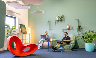 Ten slotte kreeg ook een oude zolderruimte op de tweede verdieping een opknapbeurt, om te herrijzen als focusruimte, waar in stilte gewerkt kan worden in zithoekjes of aan een bureau. De lichtgrijze geluidsabsorberende Sound Off Cloud EcoSUND wolkjes van Götessons dragen bij tot die stilte. De speelse wolkjes hangen in verschillende formaten van het plafond naar beneden. Andere blikvangers in de zithoekjes van deze ruimte zijn de rode artistieke Voido Rocking Chair (ontwerp van Ron Arad) van Magis en de flexibele, vormbare Office Nap zachte zetels van Götessons, in twee verschillende pastelkleuren. Deze laatste kunnen zowel rechtstaand als neerliggend gebruikt worden. De metalen bijzettafeltjes CUP in lichtroze en mosgrijs van het Belgische merk Perfecta staan er mooi bij. De zit/sta bureaus met T-poot, onderstel in het wit en bovenbladen in melamine witte eik zijn van Narbutas, net zoals de akoestische desk screens in de kleur light mint.