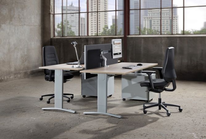 Het onderstel is afgewerkt in AL – Aluminium 9006, wat zorgt voor een strak en tijdloos contrast met het eiken blad. De tafel is in hoogte instelbaar, waardoor hij eenvoudig kan worden aangepast aan verschillende werkstijlen, zitposities of vergadersituaties — ideaal voor moderne, dynamische kantooromgevingen.