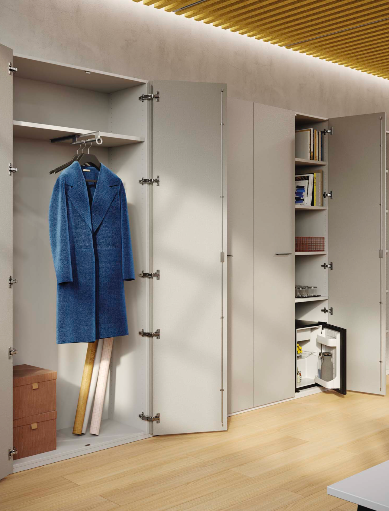 De collectie omvat kasten met deuren in melamine, lak, hout of glas, en modules met lades voor hangmappen. Dit maakt Passepartout configureerbaar en eenvoudig af te stemmen op zowel esthetische voorkeuren als functionele behoeften.