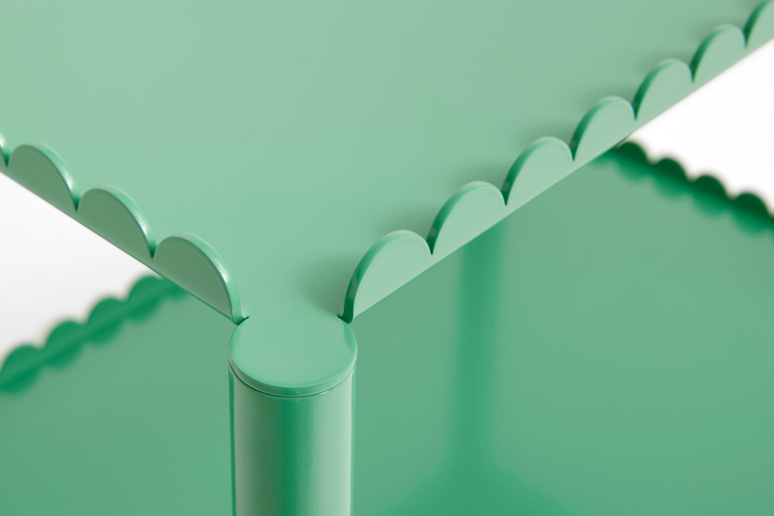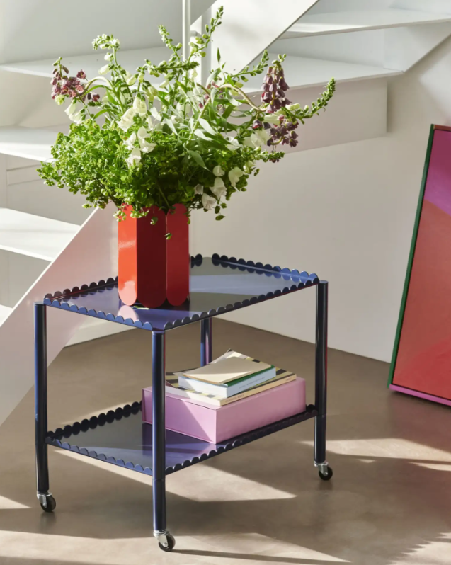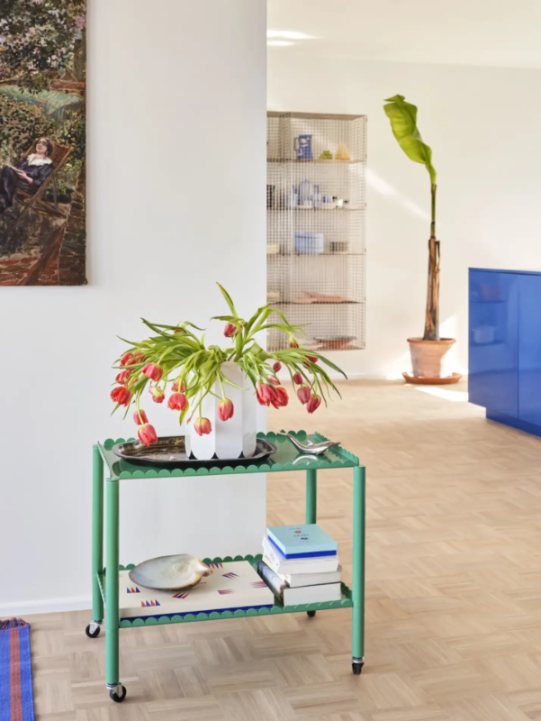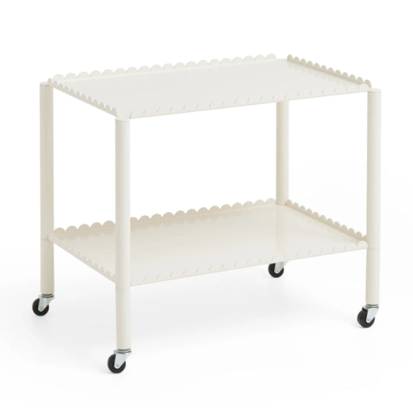 Ontworpen door het Belgische duo Muller Van Severen, is de Arcs Trolley een functionele en decoratieve trolley omgeven door een samenhangende keten van verticale bogen. Als een klein meubelstuk met een sterke aanwezigheid combineert de trolley industriële technieken met poëtische lijnen om een onderscheidende en sculpturale uitdrukking te creëren. Het elegante, gegolfde frame ondersteunt twee of drie niveaus, met slanke poten gemonteerd op wieltjes voor gemakkelijk manoeuvreren. Gemaakt van gepoedercoat staal in verschillende kleuropties, is de trolley geschikt voor de meeste kamers en toepassingen in huis, van het tonen en opbergen van items in de woonkamer tot extra planken in de keuken of als nachtkastje.