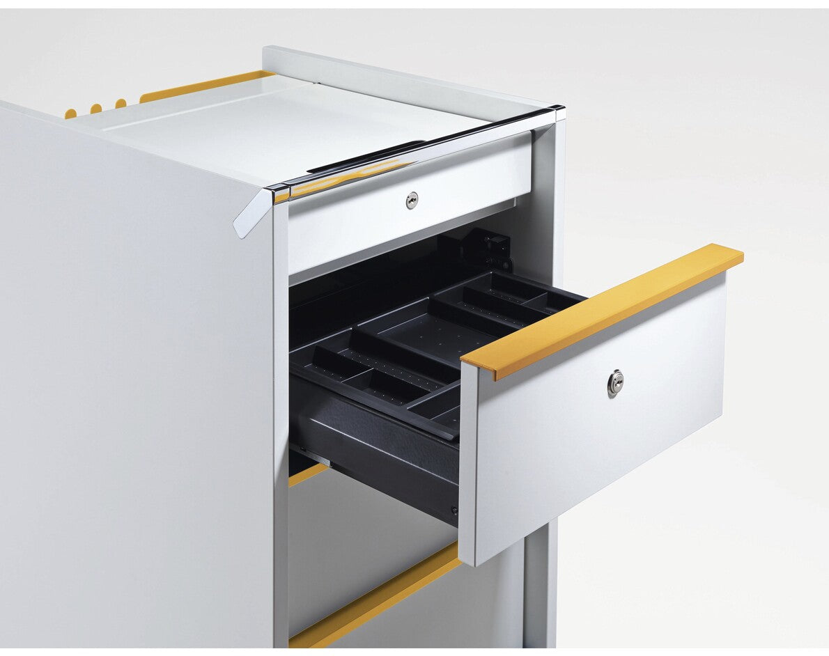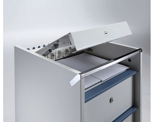 Praktische mobiele bergruimte met een stalen plaat als achterzijde. De schuifladen met geluidsarme glijders zijn mogelijk in verschillende indelingen. Deze caddy is ook voorzien van elektrische aansluitmogelijkheden voor het opladen van smartphones etc. Verkrijgbaar in verschillende uitvoeringen (configureerbaar).