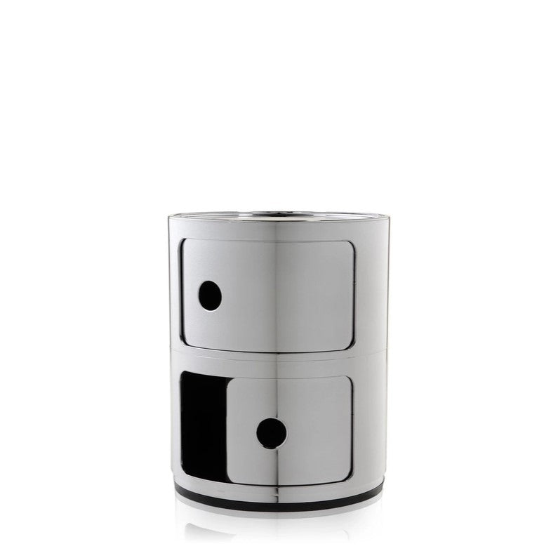 De modulaire elementen zijn ontworpen om aan verschillende behoeften te voldoen en perfect in elke kamer in huis te passen. Componibili verscheen voor het eerst in 1967 en is sindsdien uitgegroeid tot een tijdloze meubelklassieker. De Componibili van vandaag hebben een diameter van 32 cm en zijn verkrijgbaar in drie sprankelende metallic afwerkingen. Dit model is beschikbaar in twee vaste composities van twee of drie niet-stapelbare elementen.