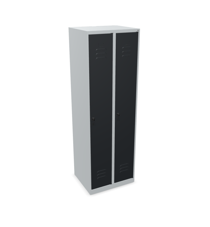 Je kiest zelf de kleurcombinatie via onze configurator: standaard wordt de kast geleverd met lichtgrijs korpus (RAL 7035) en zwartgrijze deuren (RAL 7021), maar alle RAL-kleuren zijn mogelijk.