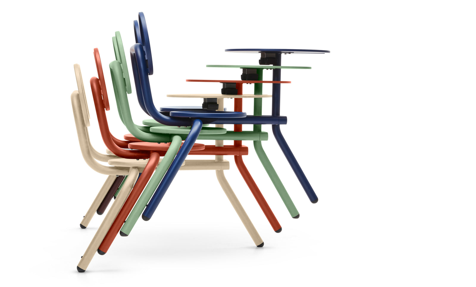 De Bistroo is een innovatieve toevoeging aan de contractmarkt: een praktische, weerbestendige eettafelset voor twee personen. Met zijn slimme ontwerp, bestaande uit drie poten, staat de Bistroo stevig op elk oppervlak. Bovendien kan deze tafel gemakkelijk gestapeld en opgeborgen worden, waardoor het een handige keuze is voor kleine ruimtes. Gestructureerd metaal met poedercoating wordt gecombineerd met handige functies en accessoires, waardoor de Bistroo zich helemaal thuis voelt in het decor van een gezellig restaurantje of op een klein stadsbalkon. Met de mogelijkheid om naast elkaar te zitten en stapelbaar tot vier stuks, biedt de Bistroo een compacte en gezellige oplossing voor kleine ruimtes.
