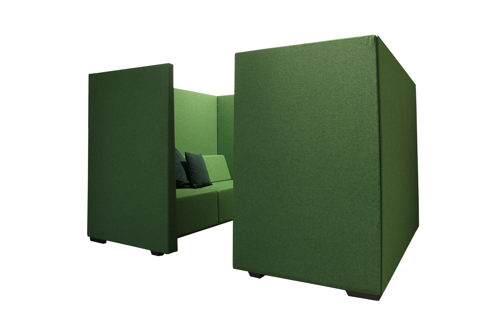 De Jazz Silent Box van Narbutas combineert akoestisch comfort met een modern design. Deze box heeft groene akoestische wanden en zwarte MDF-voetjes. Ideaal als persoonlijke werkplek of overlegruimte in een open kantooromgeving. De box bestaat uit twee losstaande kanten die samen gezet kunnen worden om een half open box te vormen.
