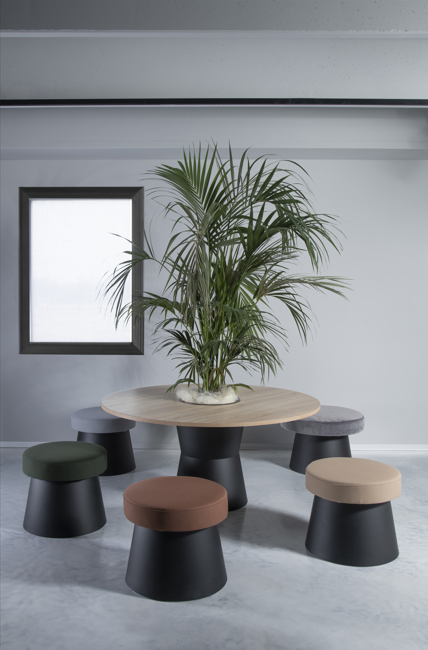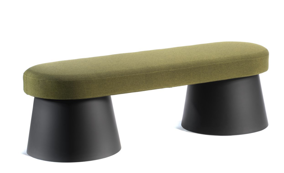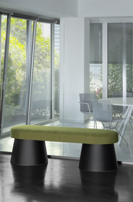 De Salt-collectie kenmerkt zich door een samenspel van eenvoudige geometrieën, functionaliteit en veelzijdigheid: poef en bank met een conische technopolymeer basis en comfortabele, gestoffeerde zitplaatsen.