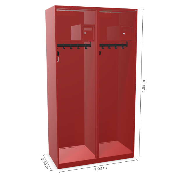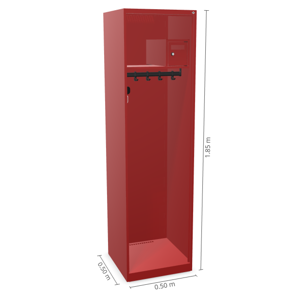 De robuuste stalen behuizing is voorzien van vloerglijders ter bescherming van zowel de kast als de vloer. Dankzij de ventilatieopeningen blijft de politie-uitrusting droog en fris, terwijl de vorming van onaangename geuren of vochtophoping wordt verminderd.