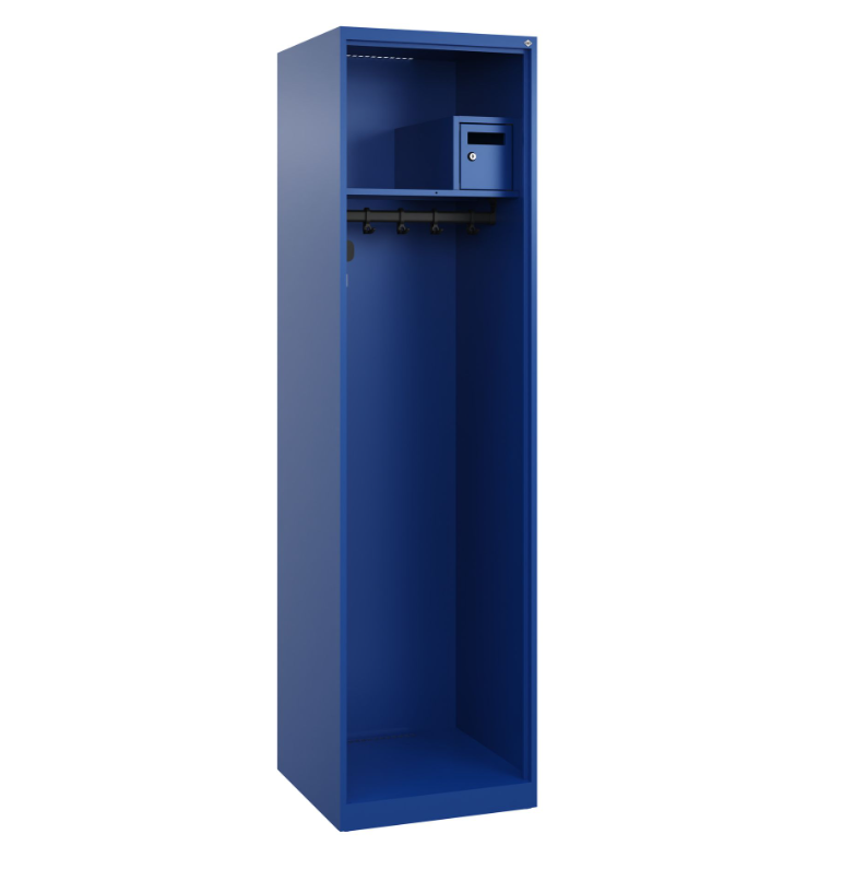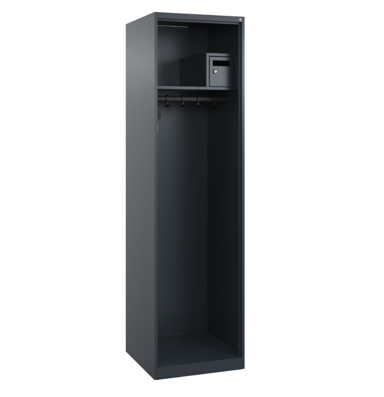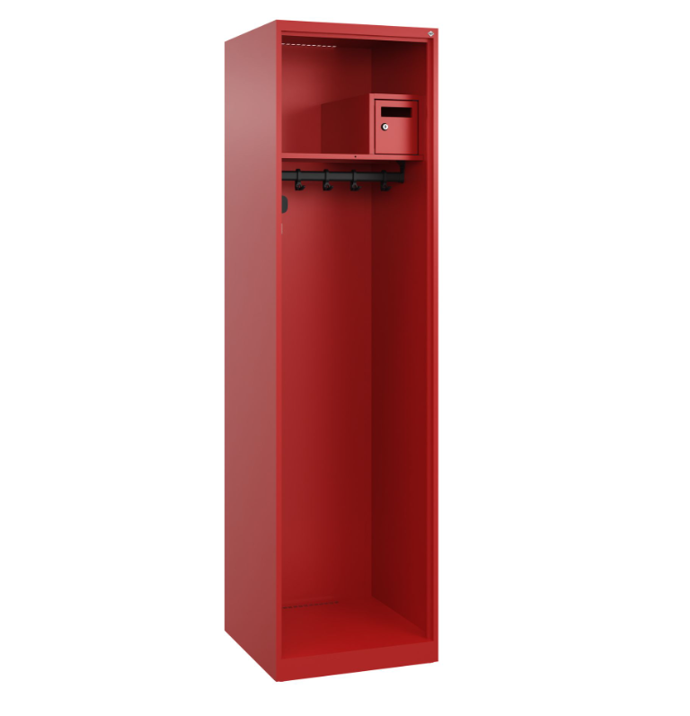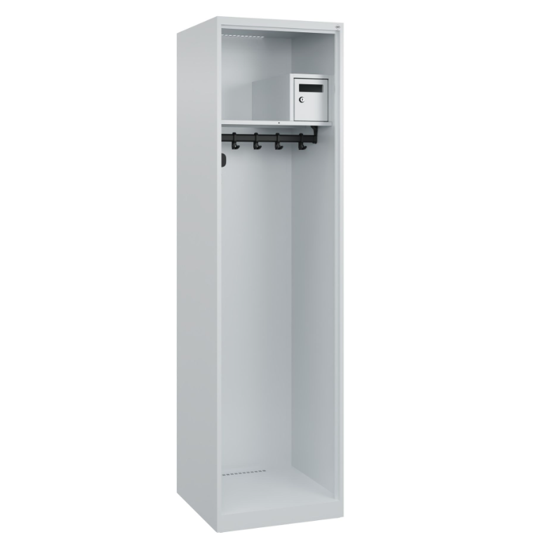 De waarde-opbergbox met inwerpopening zorgt voor een extra beveiligde opslagruimte, afsluitbaar met een cilinderslot inclusief twee sleutels. De hakenlijst aan de zijkant met drie verschuifbare roestvrijstalen haken maakt het eenvoudig om uitrusting zoals dienstgordels, handboeien of andere accessoires overzichtelijk op te bergen.