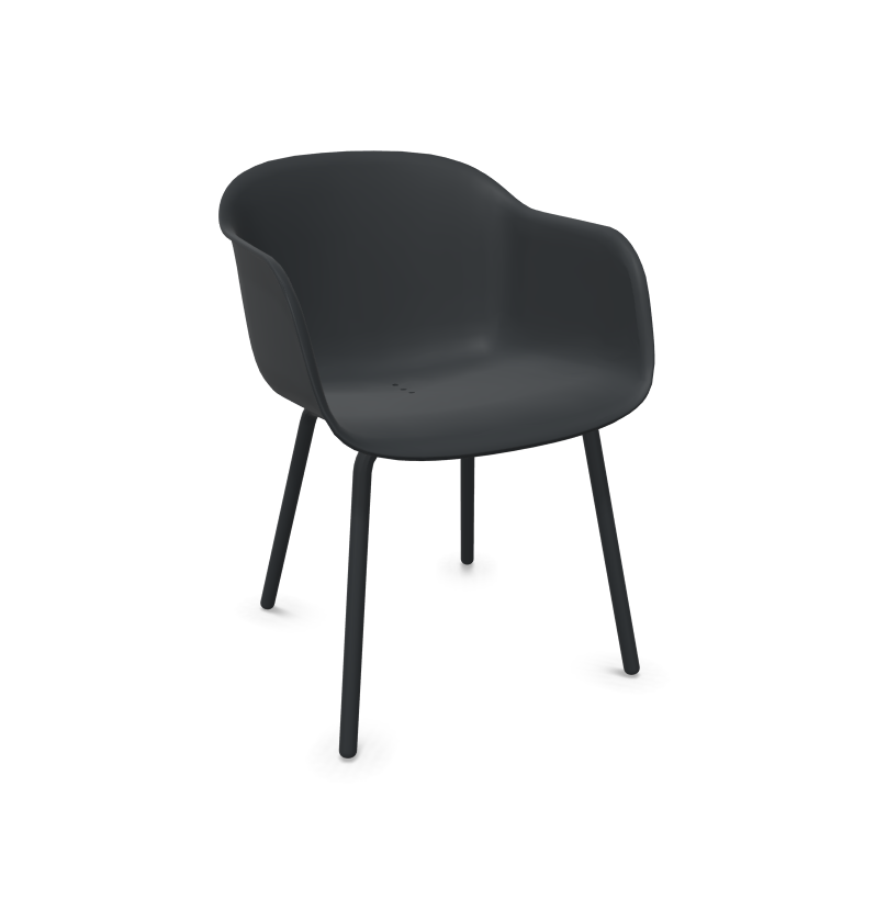 De Fiber Outdoor Armchair combineert hedendaags design met duurzame innovatie. De kuip is volledig vervaardigd uit 100% gerecycleerd plastic, afkomstig van postindustrieel afval. Per stoel krijgt minstens 2,5 kg plastic een nieuw leven. Dankzij geïntegreerde UV-stabilisatoren behoudt het materiaal zijn kleur, zelfs bij langdurige blootstelling aan zonlicht. De zachte, afgeronde vormen van de armleuningen zorgen voor een comfortabele zit, terwijl drainagegaten waterophoping voorkomen en het onderhoud vergemakkelijken.